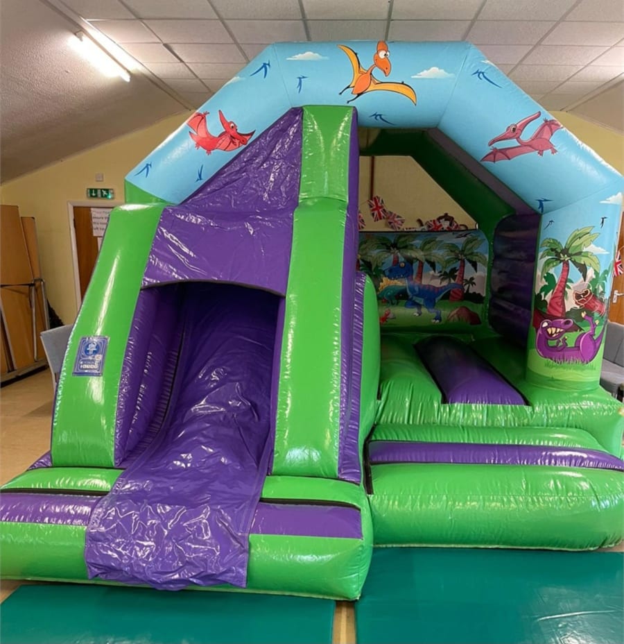 If you're looking for a bouncy castle with slide in Burton on Trent or a bouncy castle hire in Swadlincote, look no further! We deliver and set up the Dinosaur Combi Castle in these areas and the surrounding regions, ensuring a seamless experience for you.
